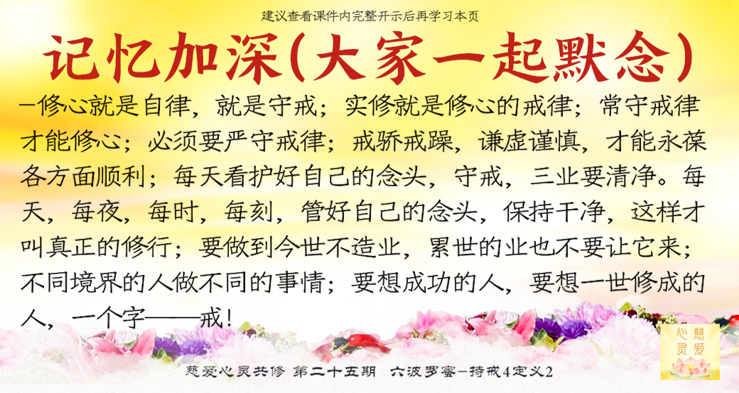 该看的看,不该看的不能看;该听的听,不该听的不能听;该说的说,不该说的就不要去说。所以孔老夫子过去讲“非礼勿视,非礼勿听,非礼勿言,非礼勿动”。要懂得,今天我们修心就是自律,就是守戒。就像法师一样,为什么他们什么都不能做?很简单——守戒律。今天我为什么能够不感染到外面人的毛病,因为我很自律,因为我在家里没有接触到外面那些污染的空气。所以守戒就是修心,守戒的一个基础就是已经好好地在修心当中了。