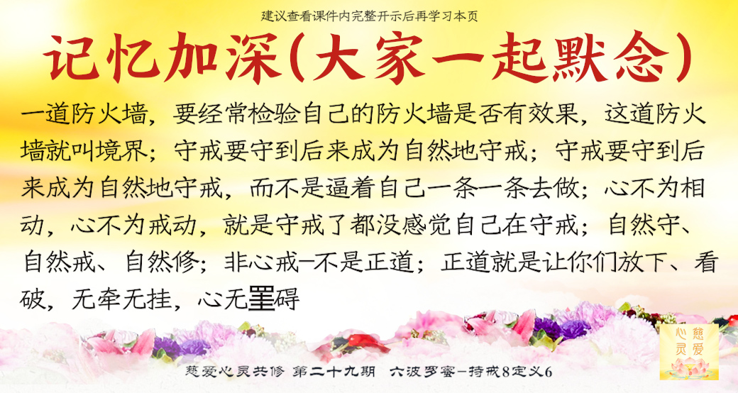 怎么样才能让自己的本性一直延续下去而不移动呢?。。。第二,要在心中觉得自己没有守戒,这叫戒法自然。不抽烟的人难道要天天去想自己今天没有抽烟吗?你不是一个打妄语的人,难道你要想自己今天没有打妄语吗?今天你没有偷东西,你是一个好人,你本来就已经守戒了,你已经是戒法自然,你已经到了不用去想自己已经守戒了,其实你还是在守戒。学佛人心中要有一道防火墙,要经常检验自己的防火墙是否有效果,这道防火墙就叫境界。经常检验自己的境界高不高,就像电脑经常要更新软件一样,学佛人也应循此法,才能因戒生慧。