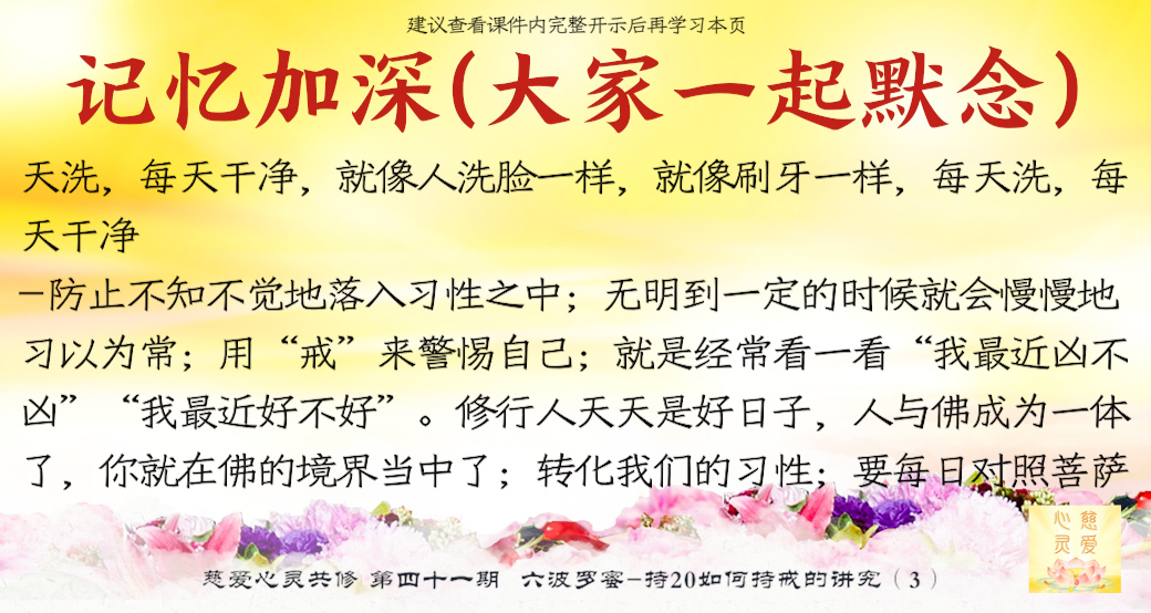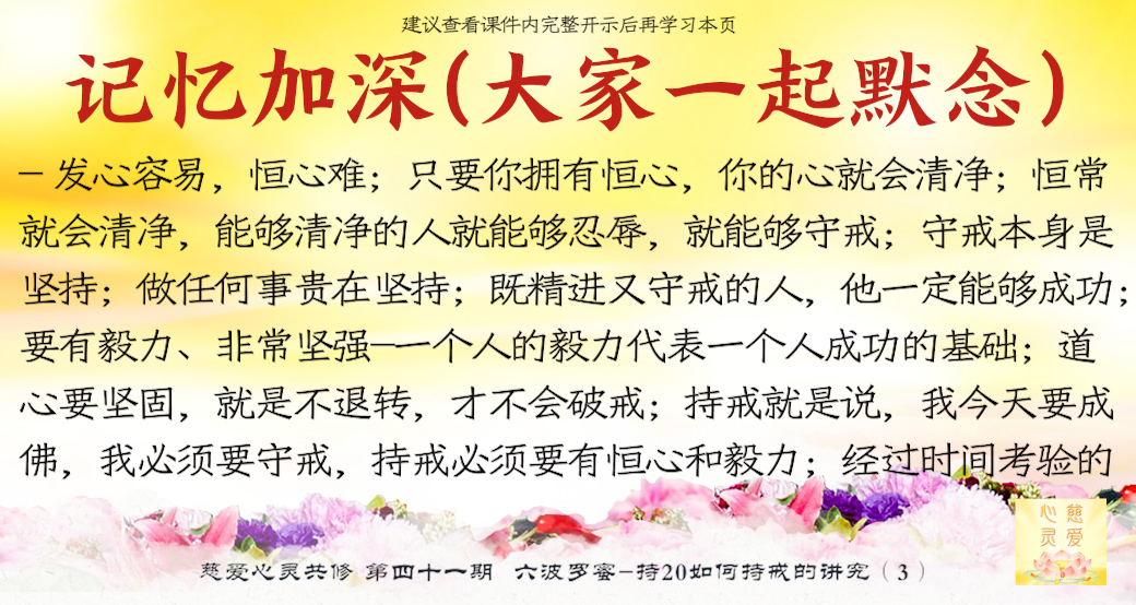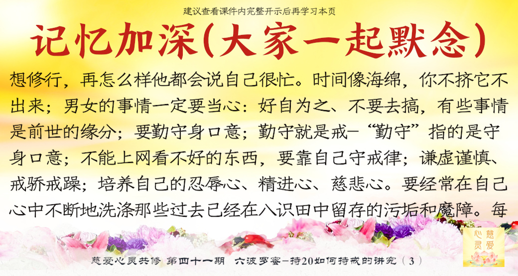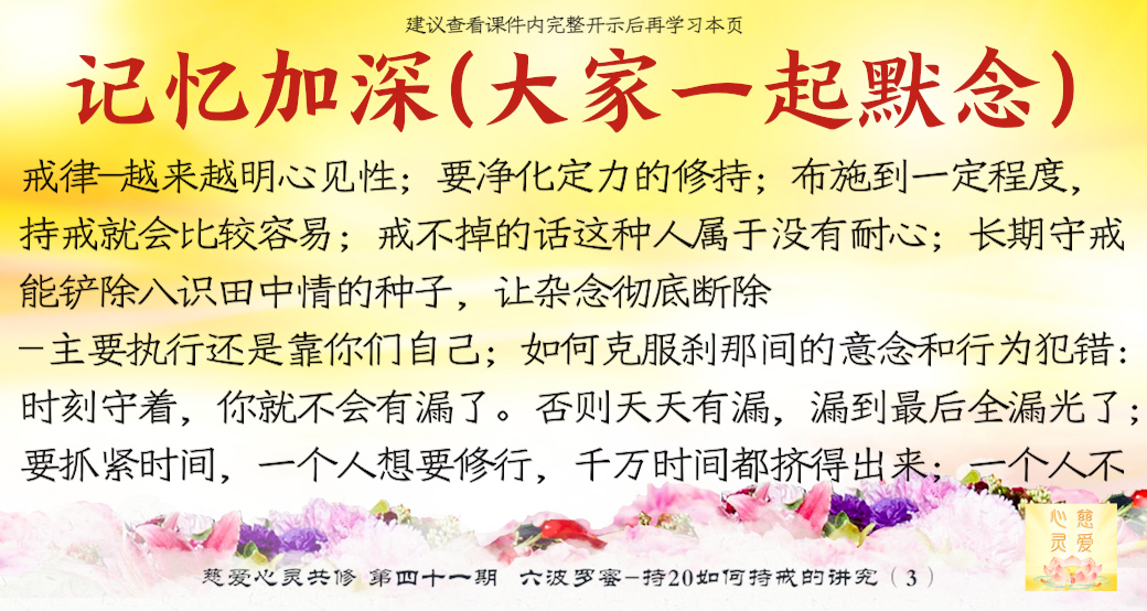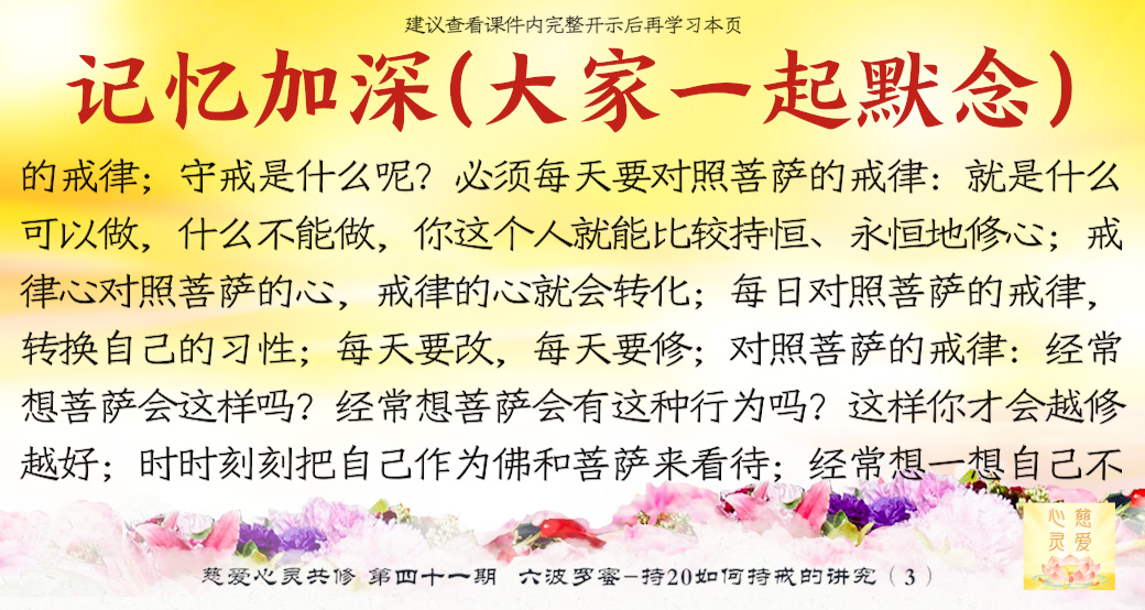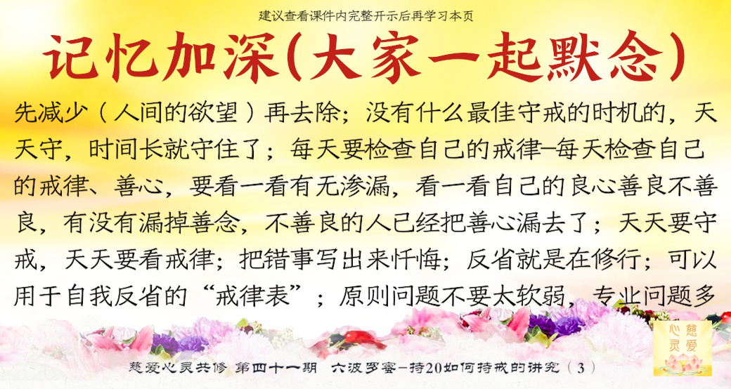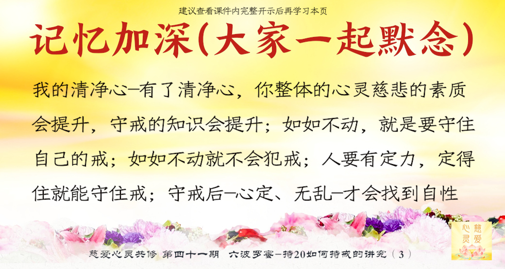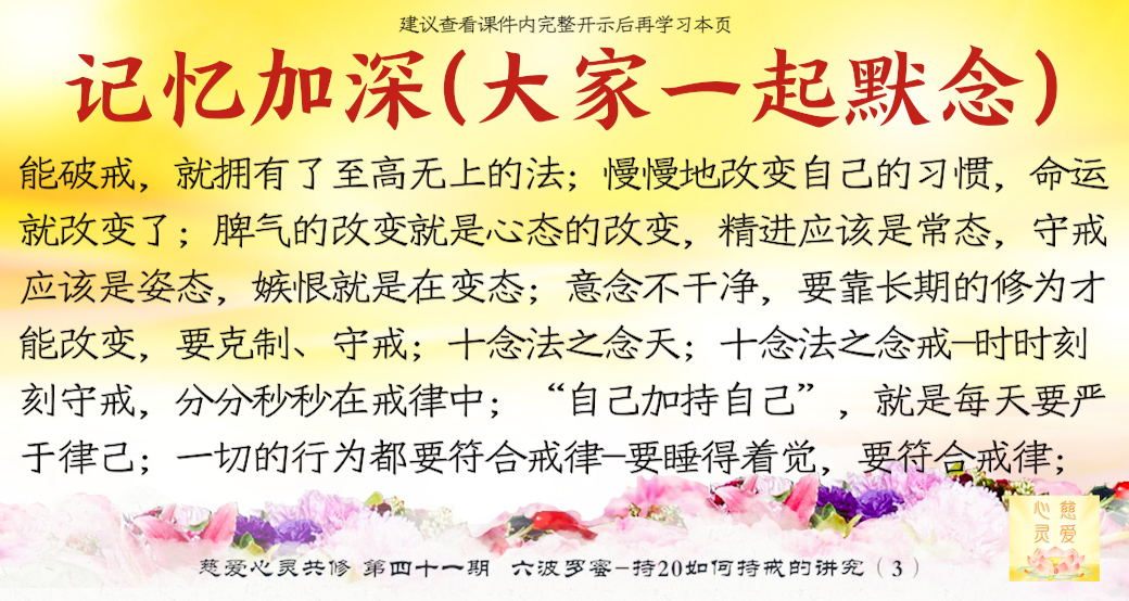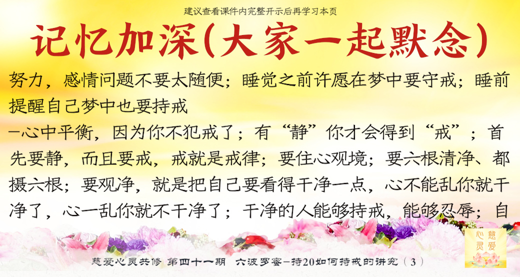 第四个叫念戒。。。守戒就是一个人的品德,一个能够守戒的人是一个好人,一个能够守戒的人,他具有高贵的品质,就证明了他。守戒的人他不会去做不好的事情,不会妄语,不会去贪瞋痴慢疑。所以守戒行为,要把它规范在自己的八识田中,时时刻刻守戒,不要忘记那些纪律,就是戒律。所以“戒乃无上菩提之本”,大家想一想,戒就是无上菩提之本,所以时时地忆念佛为我们定的一些戒律。你看,菩萨叫我们不要贪瞋痴,不要杀盗淫妄酒,这些都是佛给我们定的戒律,我们大家都要遵守,要对照自身的行为。。。时时刻刻要检查自己的行为举止,最重要的是起心动念。大家知道心是最难控制的,所以人家说心猿意马,心是攀缘心,所以整个就是不停地在动。。。你管住你的心不去动,你手上、脚上、嘴巴……一切行动都没有。所以师父叫你们起心动念要符合戒律的规范、标准,守戒,没意思的事情不要去做。在异性面前觉得自己很能干,表现一下,有意思吗?贪的东西明明得不到的,还要假装去贪一下,有意思吗?你恨了别人,你气得不得了,别人不知道,有意思吗?你恨别人恨到后来,你到背后去讲他不好,最后被对方知道了,对你进行无情的打击,你最后受到了伤害,是不是回到你身边来了?有意思吗?所以这个念戒是非常重要,时时刻刻守戒,分分秒秒在戒律中,你就能成功。