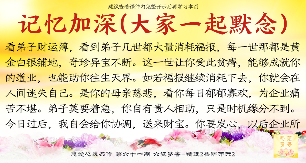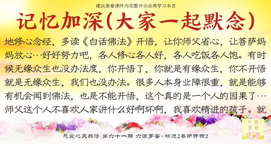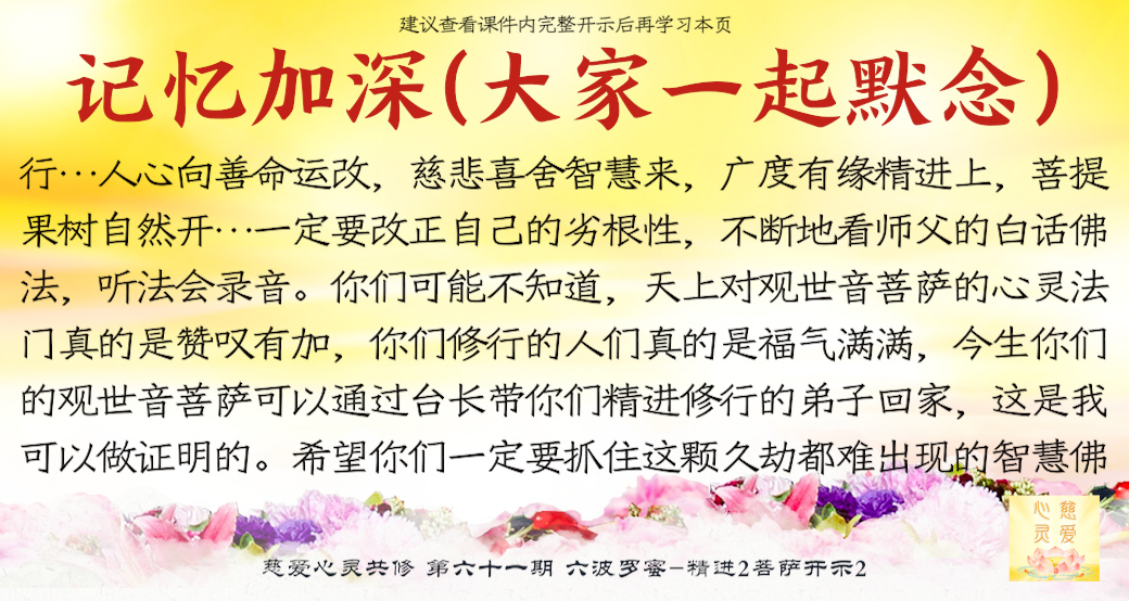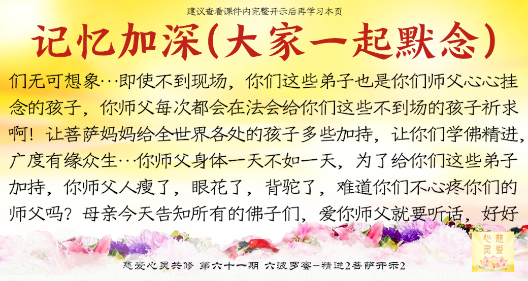 师父看到你们的成长——但是不要只是暂时的,永远保持这种精进的心,师父最开心了。很多弟子很诚心啊,真的感动天地啊。你们当中有很多都是有来历的,不要忘记自己最终的归属是在佛国净土、西方极乐世界的莲花池里,不是人间啊。感恩阿弥陀佛、观世音菩萨、大势至菩萨,感恩十方一切诸佛菩萨保佑。