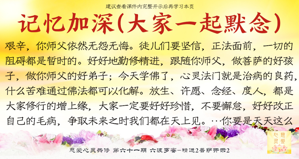 “徒儿们的真心、诚心打动老衲,心灵法门的弟子尊师重道、与人为善,天地之间都知晓。正法所向,人心向善。这期间魔障四起,阻碍重重,老衲看在眼里,痛在心中啊!徒儿们,你们要好好地精进修行,正信正念,广度有缘,为观世音菩萨分忧,为你师父分忧,才不枉费你师父的一片苦心。你师父发下大愿,来人间救度众生,无论弘法之路多么艰辛,你师父依然无怨无悔。徒儿们要坚信,正法面前,一切的阻碍都是暂时的。好好地勤修精进,跟随你师父,做菩萨的好孩子,做你师父的好弟子。你们现在就是走出来,赶走心魔,不要被一点点的小困难打垮——这才是魔道中人最想看到的。弟子们打起精神,努力修行。2018年是新的开始,心灵法门之花会撒遍亚洲、非洲、北美洲。你们要跟上你师父的弘法步伐,多去助缘你师父的每场法会,也是你们修行之路学习的捷径。