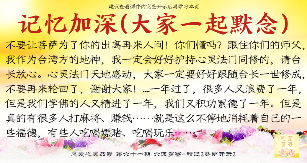 (不能听风就是雨,学佛学法就是简简单单,把佛法知识运用到你们的生活中就足够了,吃的上面以清淡为主,多多吃一些白菜,这都是对身体好的,还有胡萝卜,这都很好。不要吃刺激性大的食物,这样也是不好的,会给自己身体造成某方面的欲望,吃的上面大家也是克制一下,慢慢地就习惯成自然了。看看你们的师父多苦,清水的面条,他把爱都给了你们。你们一定要争气啊,他不求什么,只求今生能多带几个人回家,他把人间的欲望都放下了,他给予你们的是120%的能量支持。你们一定要争气,今生能冲出六道的人一定要跟好台长一起回家!时间不多了,很多的学佛人开悟的时候已经五六十岁了,时间还多吗?你们还有时间蹦迪吗?时间太少了,让你猛劲修你都不赶趟了,还不着急啊,你们师父真的心急啊,他老是说:‘如果我再早几十年像现在这么开悟我得度多少人啊!’但是您又有想过您的身体受得了吗?您为众生的辛苦,我们看在眼里疼在心里,我们知道您在人间受尽了苦难,但是您的心永远都只装着观世音菩萨和普天下的众生疾苦!您太累了,可您从来没有喊过停止,我们为您感动得涕泪横流!您为众生背了一身的业力,我们一定好好为您护法。今天您完成了观世音菩萨的大愿,我希望普天下的人也能够真心地跟随台长一世修成,今生你们说什么都要上去,不管是为了成佛还是为了众生,总之你们一定要争一口气,不要让菩萨为了你的出离再来人间!你们懂吗?跟住你们的师父,我作为台湾方的地神,我一定会好好护持心灵法门同修的,请台长放心。心灵法门天地感动,大家一定要好好跟随台长一世修成,不要再来轮回了,谢谢大家!)...一年过了,很多人又浪费了一年,但是我们学佛的人又精进了一年,我们又积功累德了一年。但是真的有很多人打麻将、赚钱……就是这么不停地消耗着自己的一些福德,有些人吃喝嫖赌、吃喝玩乐……实际上社会上随着开放,的确有一些西方的这种不好的东西给人间带来了很多的麻烦,很多人以为“哎呀,性开放了”,觉得过去怎么怎么,我们怎么,实际上他们害死自己了。现在性病流行,艾滋病横流,你想想看死多少人?过去毕竟没有这些病的,有些时候残害了多少妇女?为什么国家在禁止这些东西?不能让它蔓延,实际上很多人就借着改革开放,把资本主义的一些弊病都以为是好的。我们为什么要弘扬传统文化?就是要保护中国的这些正信正念,就是我们中华传统文化里面的仁义礼智信,这些都是非常好的东西,而不应该把那些垃圾文化一起吸收进来。有些时候会带来一些文化残渣,这些并不是一种纯的、正能量的文化,我们要保持中华五千年文化历史。为什么台长在不断地弘扬中国的传统文化和伟大的佛学精神?就是为了保持我们的正信正念,让我们的炎黄子孙、让我们的孩子、让这个世界上大家都能认清什么是正的,什么是不正的东西。现在的孩子,这个概念真的都不分了,尤其在澳大利亚,很多的孩子相互之间影响。在澳大利亚有一个省里面可以吸毒,很多人想吸毒,就赶到这个城里面,那个地方的法律就是可以吸毒的。你想想看,这个简直就是……这种法律你说你有什么办法?不是害人吗?所以现在很多学校里孩子都吸大麻。我们华人的子弟,中国的传统不能忘记!为什么我们要弘扬佛法?就是这个道理,就是让他们要懂得什么是正的,什么是邪的,因为已经直接影响到我们的生活了。我们海外华侨的孩子有很多是真的很好,教育得很好,管得严,有的真的已经坏掉了,已经被西化了,他们唯钱是利(在国内的时候好好的,出去国外受到那种西化的影响,坏了)坏了啊,就是这样的,是教育问题,是一种理念问题。所以长期在海外的孩子,如果不对他进行一些传统文化的教育,他一定会变质的,真的是一个很现实的问题,一个很严重的问题。台长也是觉得任重而道远。