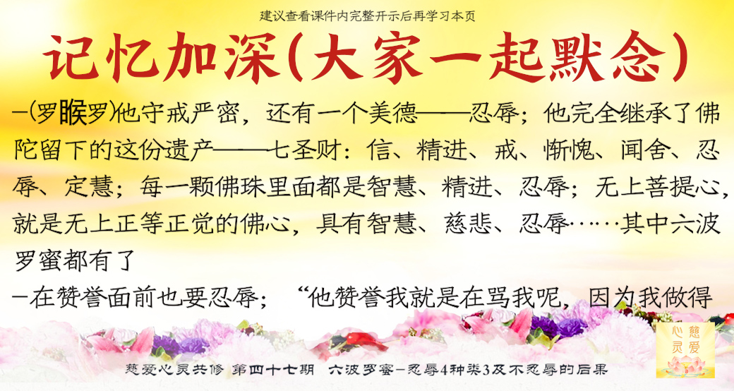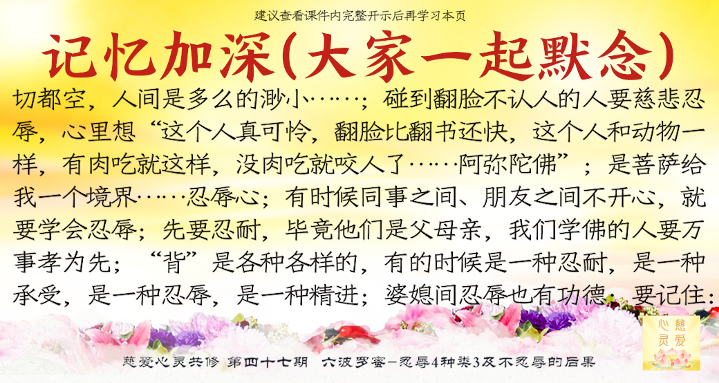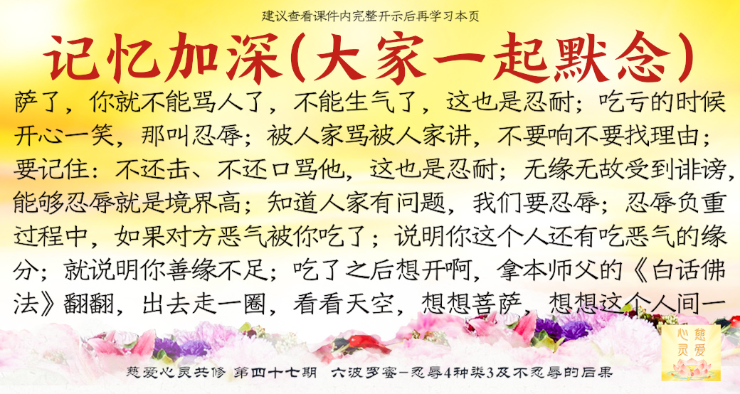 自己心中要有慈悲感,就是15分钟的时间,不管他们说什么话,能够学会忍辱精进。先要忍耐,毕竟他们是父母亲,我们学佛的人要万事孝为先。所以,先要忍耐,不要把他们当成魔。明白了吗?(对不起)以后有机会,等到他们开悟了、修心了,经常给爸爸妈妈念经,保佑他们身体好。经常跟爸爸妈妈说:“爸爸妈妈,我每天磕头就帮你们求身体好,希望爸爸身体好。”就是不相信的人,天天听女儿这么讲,他也会动心的。难道就给人家脸色看,“魔王又讲话了”?