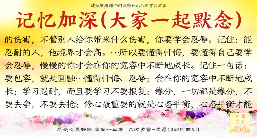 我们人要学会转化人间的外境给你带来的伤害,不管别人给你带来什么伤害,你要学会忍辱。记住:能忍耐的人,他境界才会高。…所以要懂得忏悔,要懂得自己要学会忍辱,慢慢的你才会在你的宽容中不断地成长。记住一句话:要包容,就是圆融。圆的东西它才能往前走,想一想,如果汽车的轮子不是圆的,它能往前走吗?