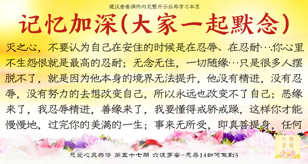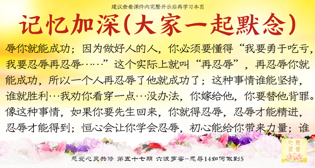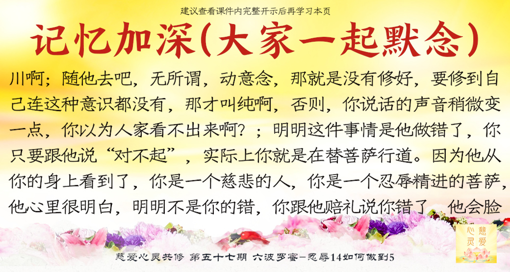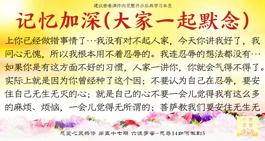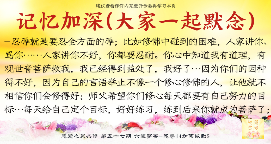 大家来了就是想好好修,修到一定的程度可以使家里好,家里好了你不是也好了吗?修心苦啊,也要忍辱。很多老公说“你不要去了,听什么东西啊?有什么用啊?”他造口业了,你要不要忍辱?忍辱就是要忍全方面的辱。比如修佛中碰到的困难,人家讲你、骂你……人家讲你不好,你都要忍耐。你心中知道我有道理,有观世音菩萨救我,我已经得到益处了,我好了。人家讲坏话你也不要顶撞,你要忍耐。你们有些人,先生还没开悟,太太还没开悟,这就叫果。因为你们的因种得不好,因为自己的言语举止不像一个修心修佛的人,让他就不相信你们会修得好。