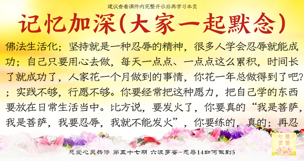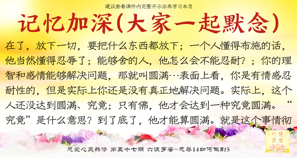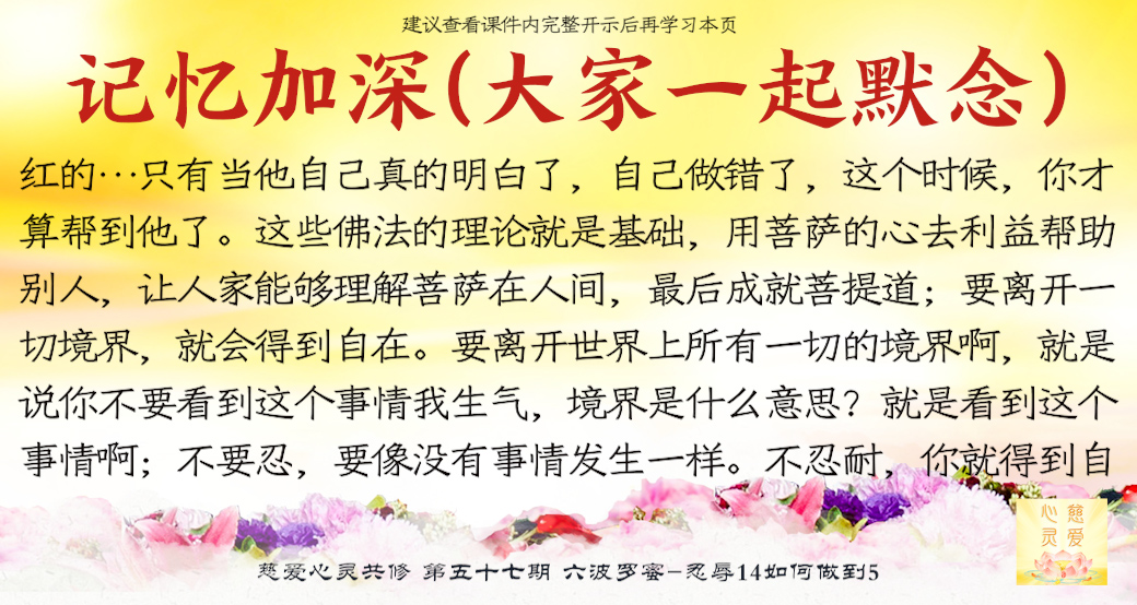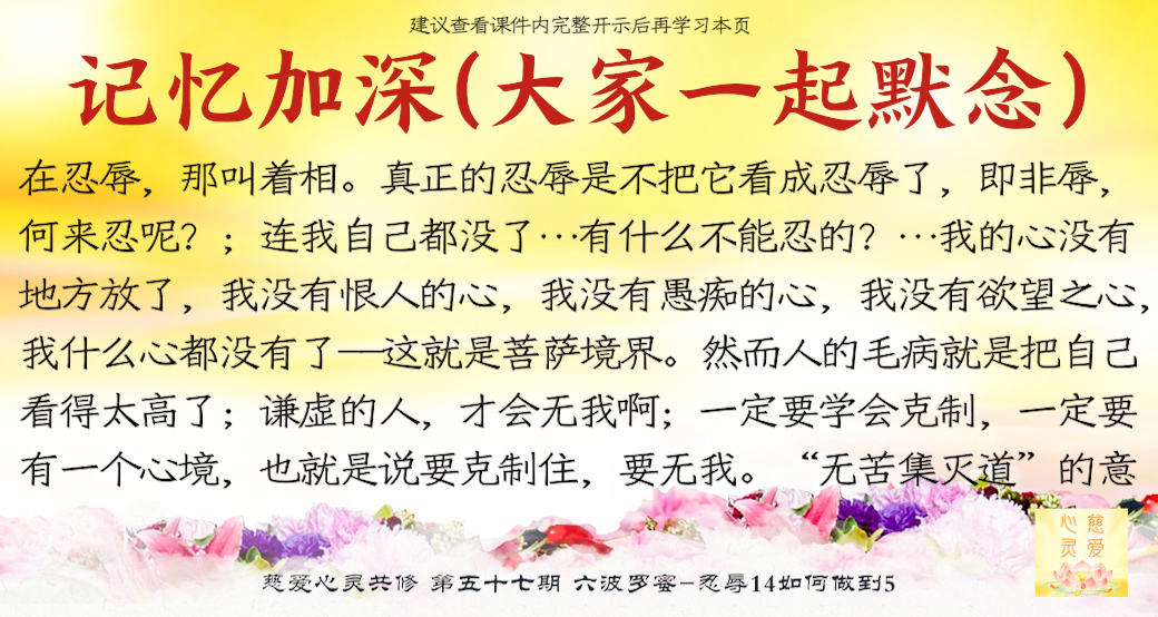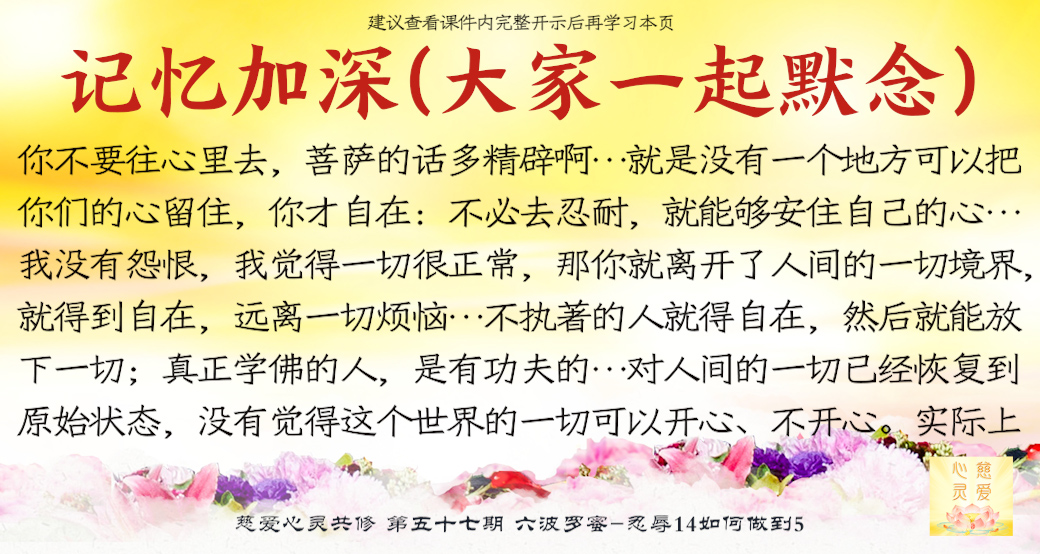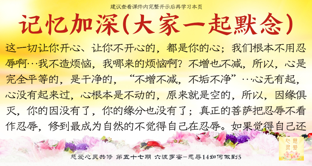 大家来了就是想好好修,修到一定的程度可以使家里好,家里好了你不是也好了吗?修心苦啊,也要忍辱。很多老公说“你不要去了,听什么东西啊?有什么用啊?”他造口业了,你要不要忍辱?忍辱就是要忍全方面的辱。比如修佛中碰到的困难,人家讲你、骂你……人家讲你不好,你都要忍耐。你心中知道我有道理,有观世音菩萨救我,我已经得到益处了,我好了。人家讲坏话你也不要顶撞,你要忍耐。你们有些人,先生还没开悟,太太还没开悟,这就叫果。因为你们的因种得不好,因为自己的言语举止不像一个修心修佛的人,让他就不相信你们会修得好。