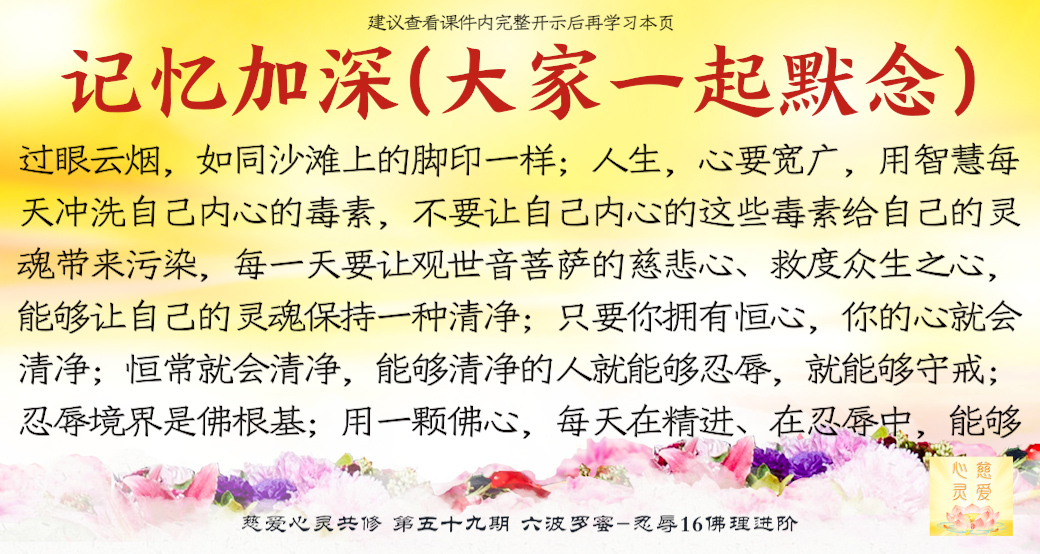 要学会调伏自己的身心、自己的心情。修忍辱,修波罗蜜,一切都会过去,如同过眼云烟,如同沙滩上的脚印一样。当你走过沙滩的时候,留下了你的足迹;当你再回头的时候,一阵海浪把你的脚印全部打没了。人生,心要宽广,用智慧每天冲洗自己内心的毒素,不要让自己内心的这些毒素给自己的灵魂带来污染,每一天要让观世音菩萨的慈悲心、救度众生之心,能够让自己的灵魂保持一种清净。